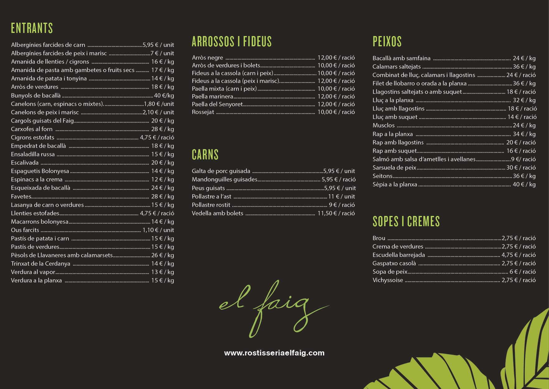 Tots els plats de la carta es fan a casa nostra de forma casolana, amb productes de qualitat i proximitat. Alguns es fan únicament per encàrrec i d’altres segons producte de temporada. No dubtin en contactar amb nosaltres per més informació.